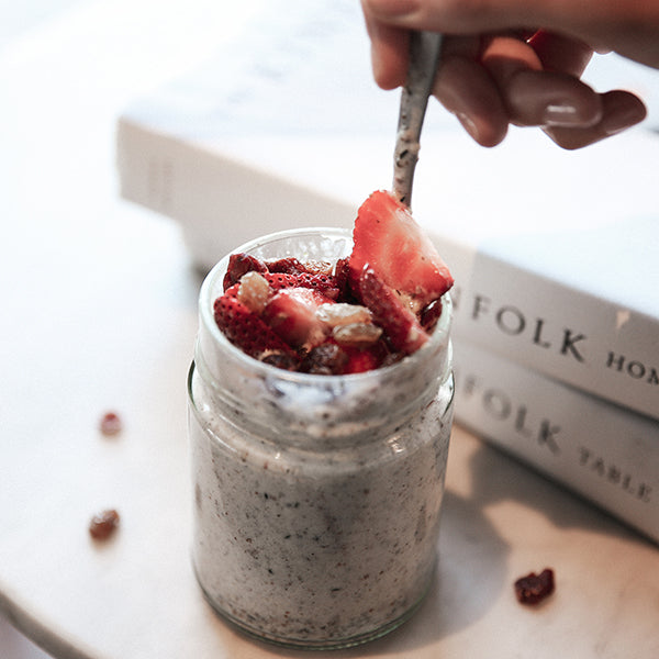 Open a Daily N'Oats packet and empty into an Overnight N'Oats Jar or mason jar. Pour up to 6-8 oz of milk or milk substitute (almond milk, oat milk, soy milk, coconut milk, etc.).